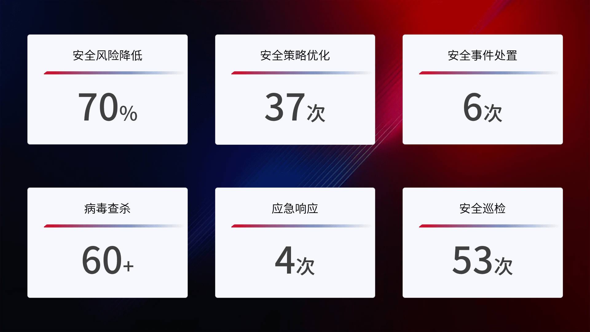 提供全面的安全事件报告体系,,,,包括处置报告、、、周报、、季度和年度总结,,,,结合持续监控,,帮助客户深入了解网络安全状况。。。。